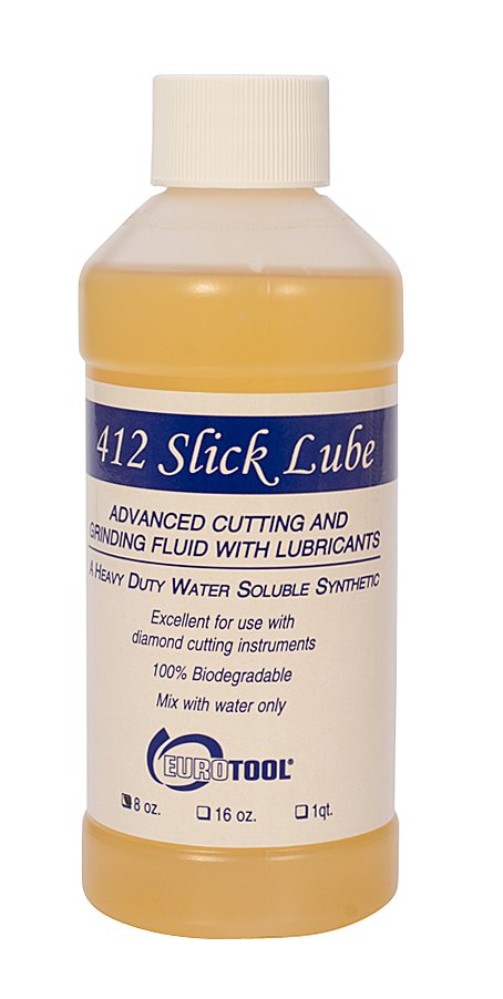 412 Slick Lube is the most advanced coolant on the market today. A 100% synthetic polymer coolant which is a unique blend of wetting agents lubricants and rust inhibitors. Excellent for drilling and cutting with diamond instruments. Slick Lube contains no nitrosamines phenols nitrates sulphur chlorine phosphates or oil. It controls dermatitis with the addition of skin conditioners. Mix 1 part Slick Lube and 10 parts water and you have the best in a water soluble lubricant.